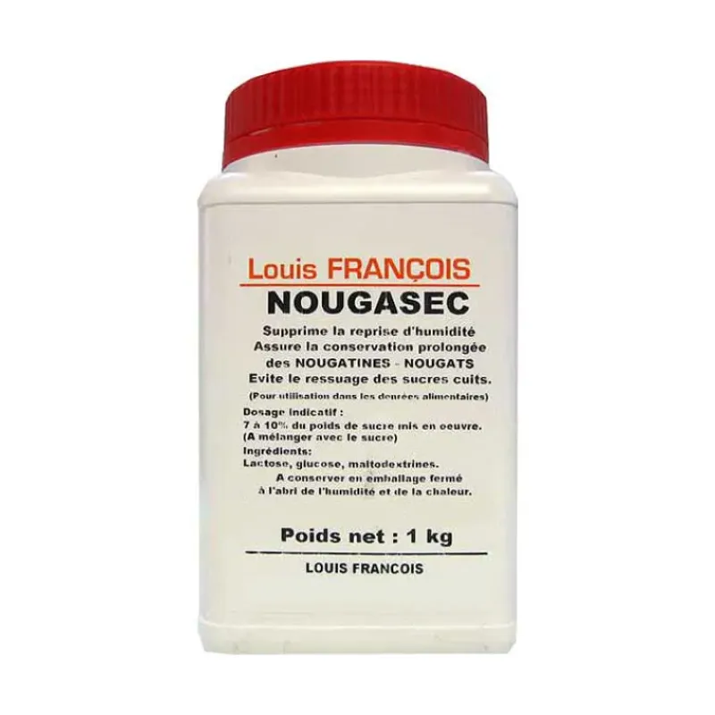 La poudre Nougasec supprime radicalement la reprise d’humidité des nougatines, nougats, pralines, cornets à glace, crêpes dentelles, éventails… en assurant la conservation prolongée. Nougasec évite le ressuage et le collage des sucres cuits.