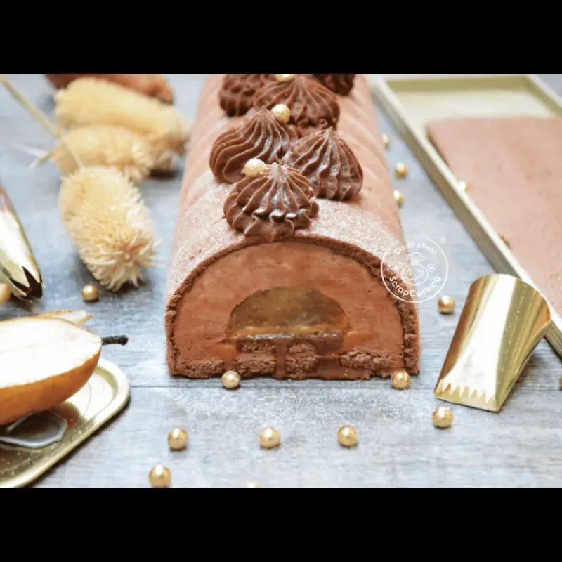 Vous trouverez à l’intérieur de ce moule silicone, une recette bûche de noël chocolat, poire caramel que vous pourrez réaliser grâce au Moule Bûche Silicone 25 cm Scrapcooking et au Moule Silicone Insert Bûche 25 cm Scrapcooking.
