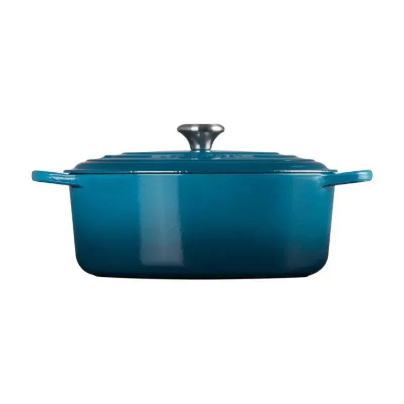 Cette Cocotte en fonte Ovale 31 cm Deep Teal Le Creuset Signature est composée de fonte, un matériel anti-adhésif et un excellent conducteur de chaleur ! Avec cette cocotte, vous pouvez assurer une cuisson uniforme, de son fond jusqu’au couvercle. De plus, la cocotte en fonte émaillée Le Creuset est dotée d’un couvercle hermétique qui conserve la chaleur, mais aussi d’un bouton en acier inoxydable et résistant à la chaleur sans limite de température.