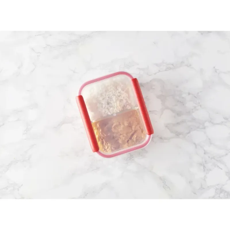 Parmi la gamme de boîtes hermétiques proposée par Mastrad, il en existe une avec la particularité d’être composée de 2 compartiments distincts de même grandeur. Très pratique pour transporter vos repas sans mélanger les aliments, la boîte alimentaire compartimentée en verre borosilicate (sans bisphénol A) possède une contenance de 1 litre, un couvercle avec 2 poignées et un joint silicone amovibles de couleur rouge. Cette boîte compartimentée possède également les mêmes caractéristiques techniques que le reste de la gamme Stor’eat, à savoir une résistance aux températures extrêmes de -20°C jusqu’à 400°C. Cette robustesse lui permet d’être utilisable au four, congélateur, réfrigérateur, micro-ondes et même au lave-vaisselle.