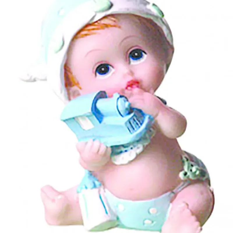 Cette figurine bapteme garçon représente un bébé assis tenant dans ses mains une locomotive.