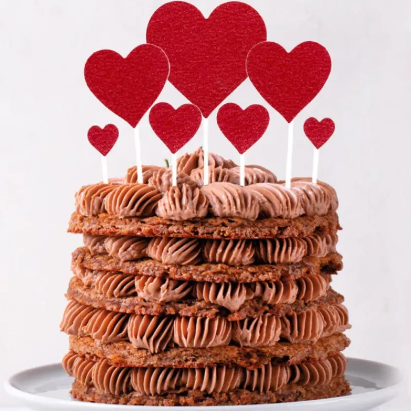 Le set de cake topper comprend une variété de tailles : 2 petits cœurs (2,5 cm), 2 cœurs moyens (3,5 cm), 2 grands cœurs (5,5 cm) et 1 très grand cœur (8 cm), ce qui permet de créer un joli dégradé de cœurs rouges jouant avec les proportions pour un effet visuel harmonieux et romantique. Fabriqués en papier carton et plastique, ces toppers gâteau sont à la fois légers et résistants, parfaits pour sublimer vos entremets et cupcakes.