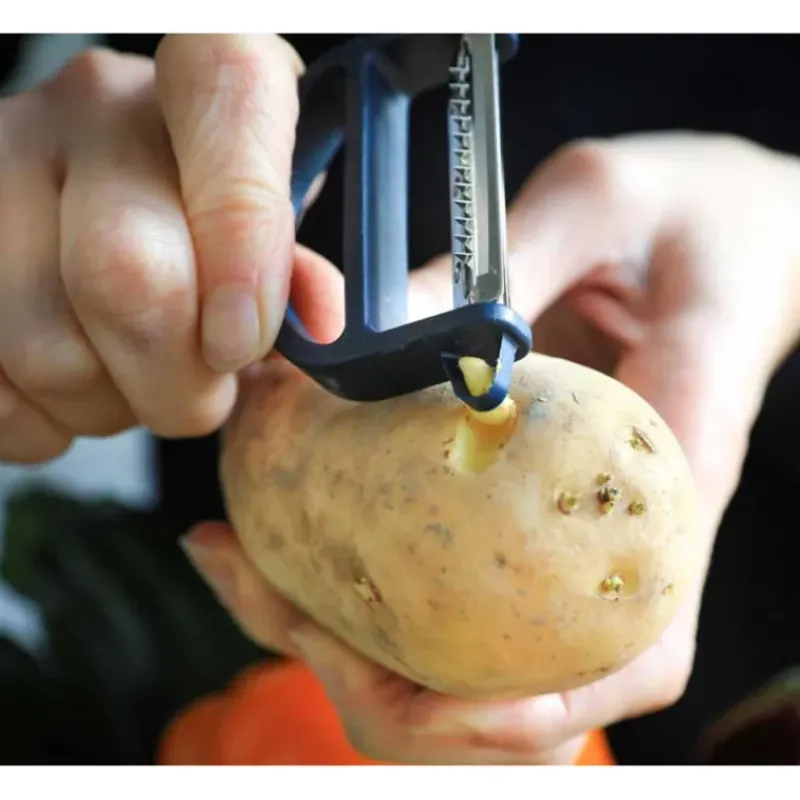 Il vous sera également possible de découper vos légumes en julienne grâce à la seconde lame de l’épluche légumes. Les yeux des pommes de terre ne résisteront pas non plus à cet ustensile pourvu d’un embout enlève-yeux.