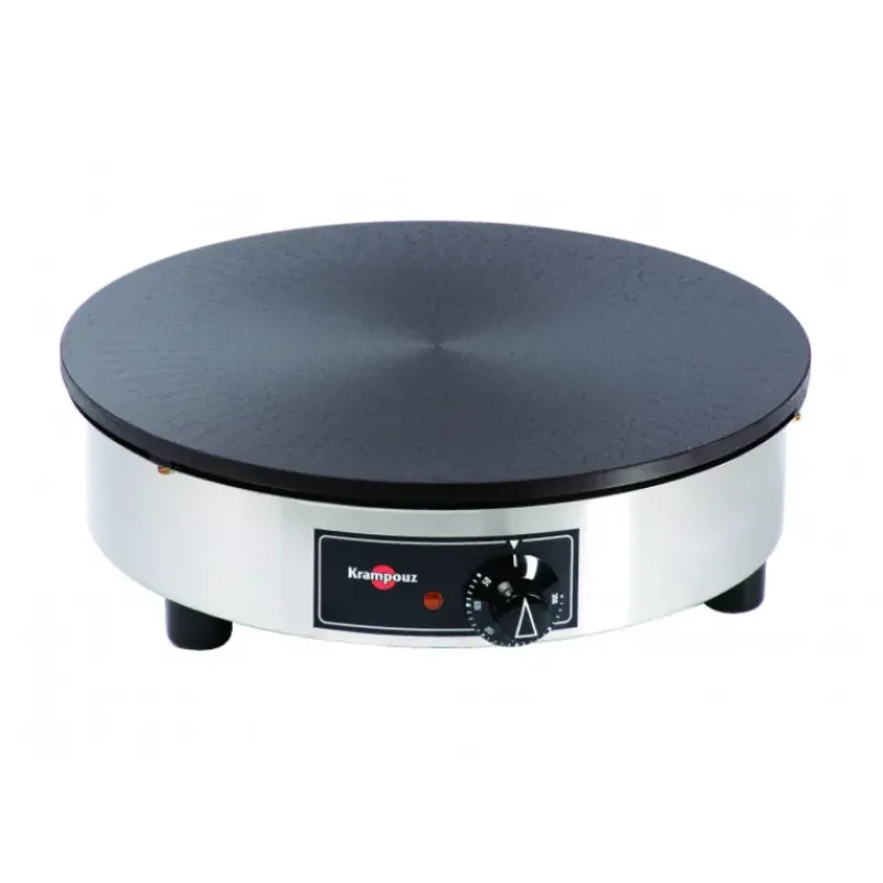 La crêpière professionnelle Ø40 cm Krampouz dispose d’un thermostat réglable de 50 à 300°C. Son témoin lumineux permet de voir en un coup d’oeil si elle est prête à être utilisée. La crêpière professionnelle Krampouz repose sur trois pieds en plastique qui lui assure une bonne stabilité.