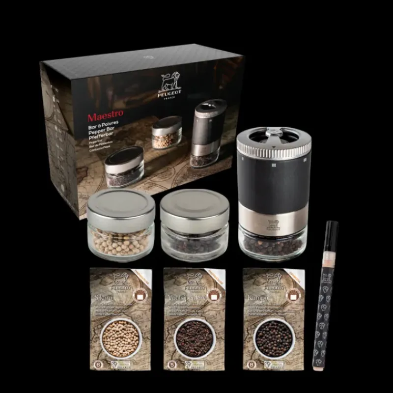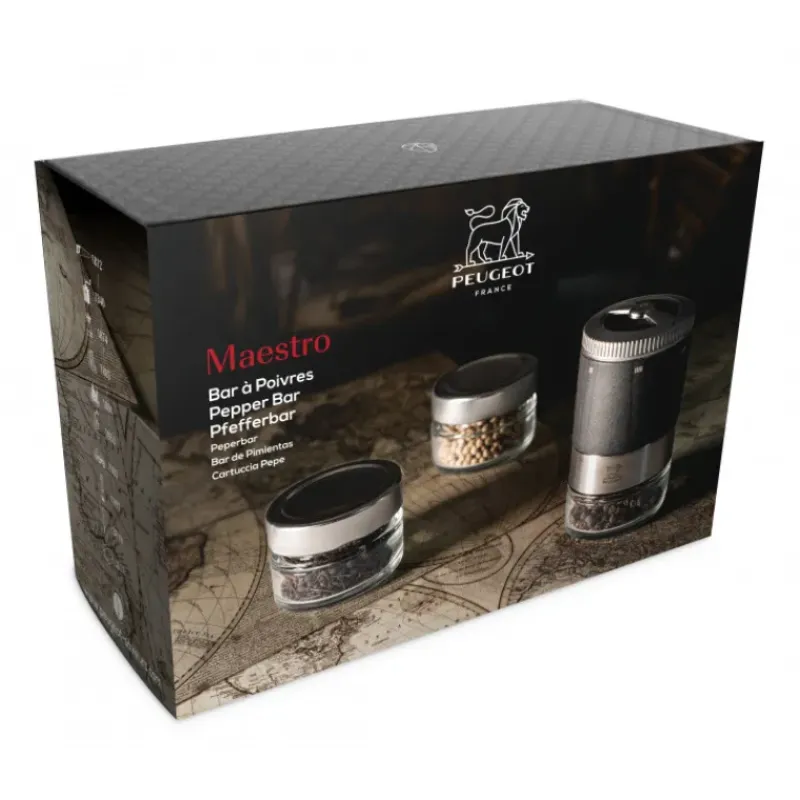 Bar à poivre Maestro avec Moulin, Réservoirs et 3 poivres Peugeot