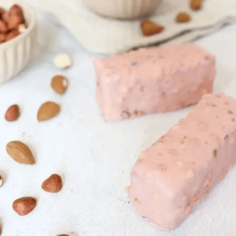 - Ingrédients : Chocolat blanc 70% (sucre, beurre de cacao, lait entier en poudre, protéines de lait en poudre, lait écrémé en poudre, émulsifiant (lécithine de soja), arôme naturel), huile de tournesol, noisette caramélisée 4%, amande caramélisée 3%, denrées alimentaires colorantes (concentré de radis, carottes et cassis).