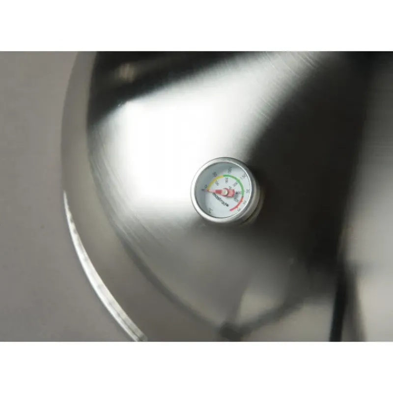 Grâce au Couvercle en acier inoxydable, vous pourrez réaliser des cuissons à l’étouffée, ou encore garder au chaud vos plats plus longtemps. Le couvercle est muni d’une poignée sertie de silicone pour éviter tout risque de brûlure. De plus, un thermomètre est intégré à celui-ci, pour un suivi précis de votre cuisson. Par ailleurs, le couvercle ne salira pas votre plan de travail, car celui-ci peut être fixé aux charnières de la plancha.