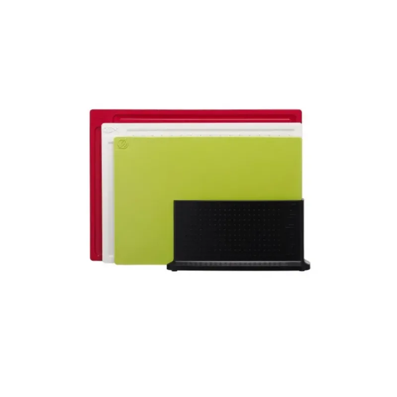 Les planches à découper Bodum sont présentées dans un socle avec une finition en caoutchouc pulvérisé et dont les pieds sont en silicone. Grâce au socle, les planches sont suffisamment espacées et restent à portée de main.