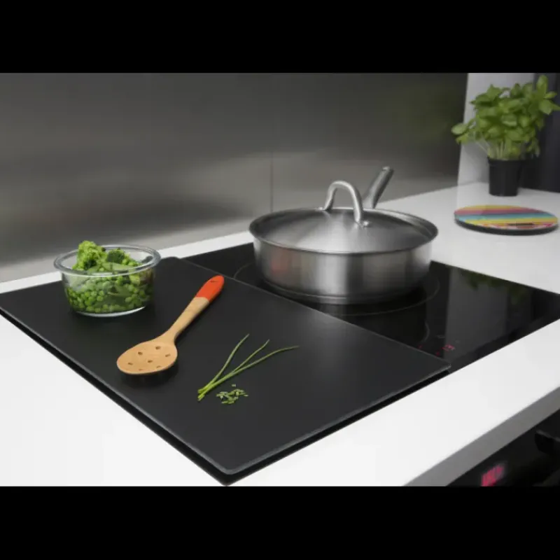 Lorsque vous cuisinez, placez votre plaque en verre trempé sur le côté pour y déposer un récipient, une cuillère en bois ou vos divers ingrédients prêts à être ajoutés dans votre recette.