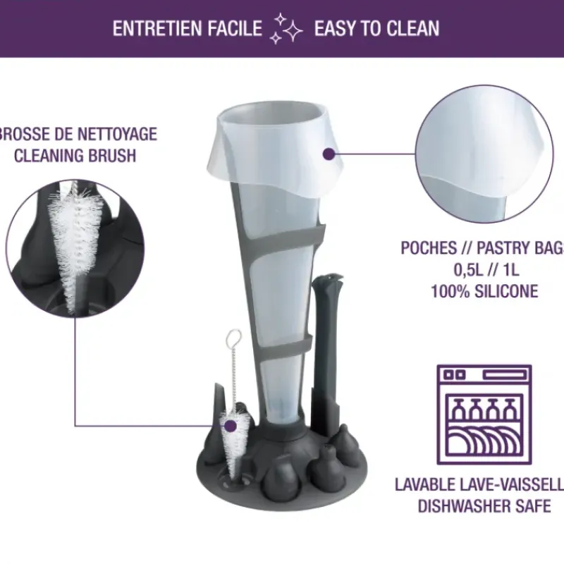 Le support fourni se révélera très pratique, non seulement pour le rangement, mais également pour remplir votre poche à douille ! En effet, en déposant votre poche à douille sur son support, vous pourrez la remplir aisément et proprement, en ayant vos deux mains libres… Il ne vous reste plus qu’à fermer votre poche à l’aide de la pince incluse dans le kit. En plus d’ajouter une touche esthétique dans votre cuisine, le support vous sera aussi pratique pour avoir toujours votre ustensile à portée de main.