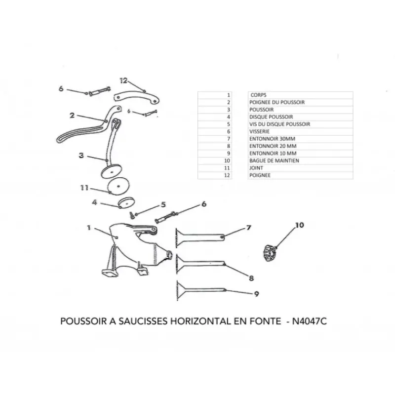 Le poussoir à saucisses en fonte grâce à son mécanisme manuel horizontal, vous permet de mettre en boyaux les chairs à saucisses, les boudins et également de farcir des poivrons ou piments.