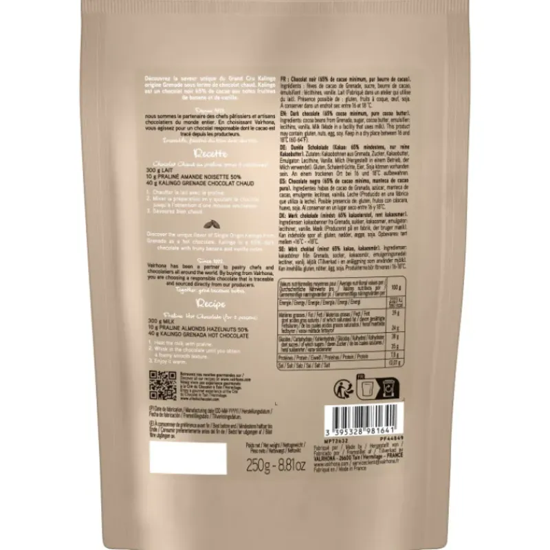 Prête à l’emploi, cette préparation gourmande de Valrhona vous permettra de réaliser en un clin d’œil un chocolat chaud maison exquis et rempli de saveur. Elaborée à base de chocolat noir Kalingo 65%, ce grand cru pur origine Grenade apportera à votre boisson chocolatée des notes fruités de banane et de vanille.