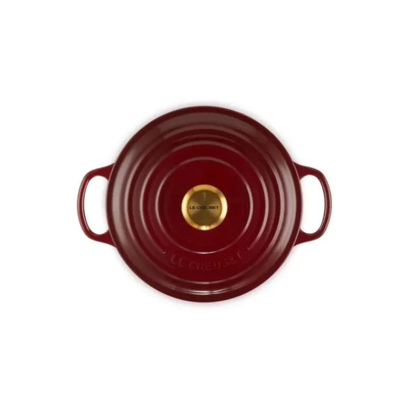 Concoctez de délicieux repas dans votre Cocotte en Fonte Ronde 24 cm Garnet Bouton Doré Le Creuset Signature pour toute la famille.