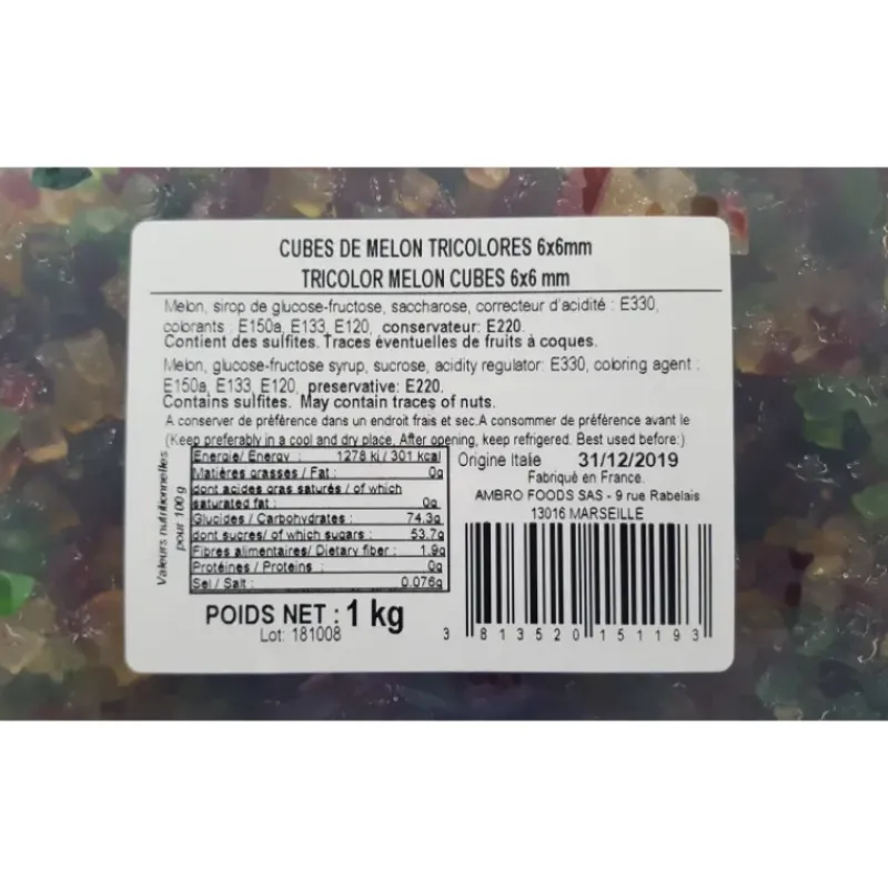 Grâce à ces Cubes de melon confit tricolores 1kg, vous obtiendrez une magnifique texture avec des notes colorées !