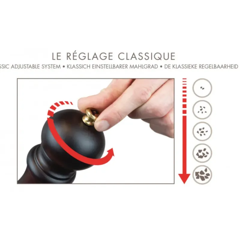 Le moulin à poivre et le moulin à sel Peugeot sont coiffés d’un bouton en acier brossé qui permet de régler la mouture. Plus le bouton est serré, plus la mouture est fine, et inversement.