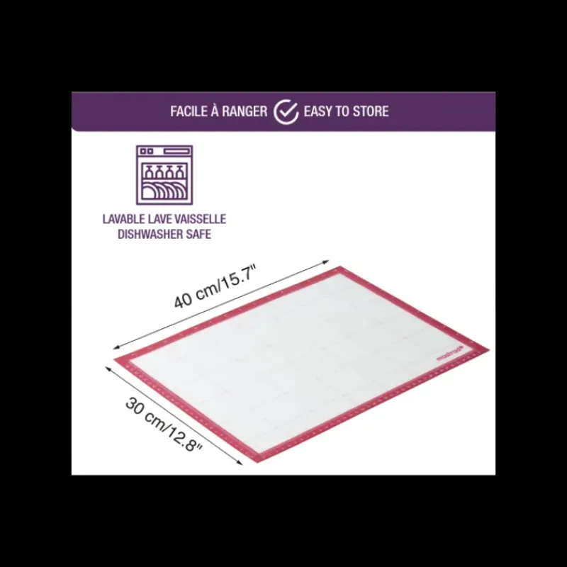 En plus d’être design et moderne, le tapis silicone est économique et réutilisable à souhait ! Aisément lavable à l’aide d’une éponge ou d’un lave-vaisselle, sa matière en fibre de verre imprégnée de silicone lui donne la propriété d’être anti-adhérant. De ce fait, la matière grasse et les odeurs alimentaires ne subsistent pas. En outre, le tapis de cuisson résiste aux températures variant entre -40°C et +230°C : il est parfaitement adapté à une cuisson au four et peut trouver sa place au congélateur.
