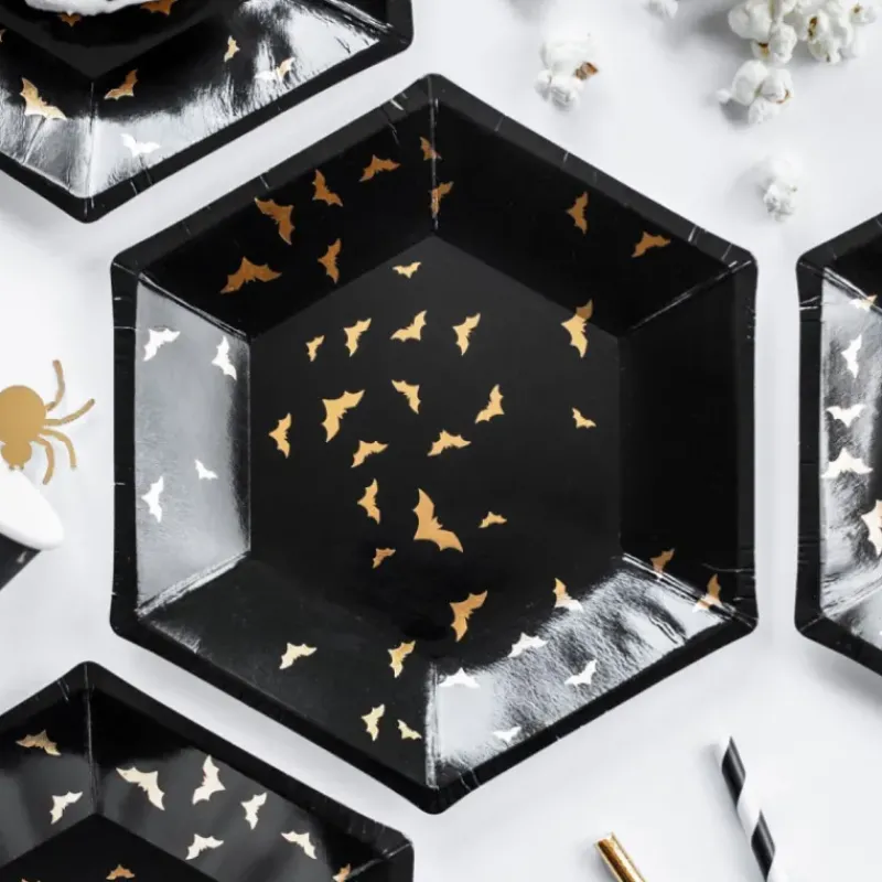 Leur design aussi effrayant qu’élégant raviront petits et grands ! L’association de couleurs entre les chauves-souris aux détails dorés et le fond noir obscur et profond est parfaite pour apporter un côté chic à votre soirée ! Retrouvez 6 assiettes en carton de 20 cm de qualité supérieure pour une décoration de table Halloween réussie.
